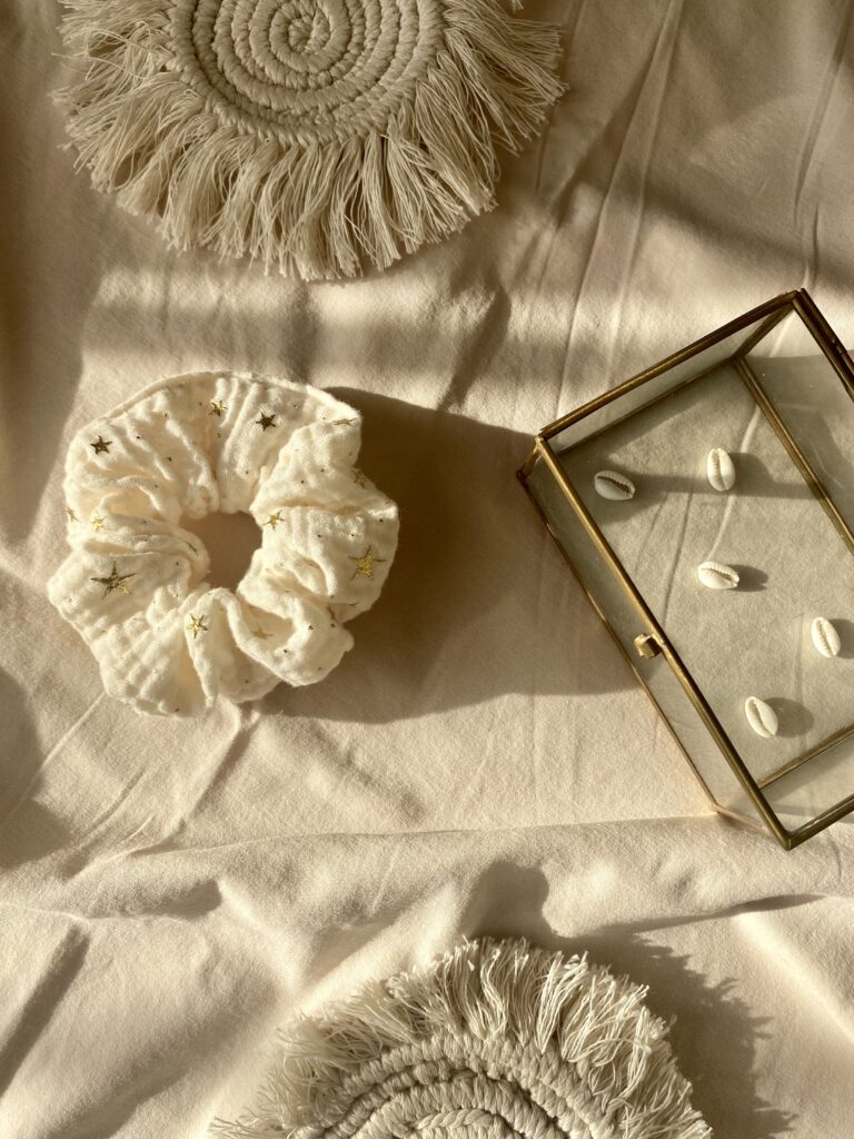 – Scrunchie „Sparkle“ mit goldenen Sternen aus Musselin Stoff gefertigt –