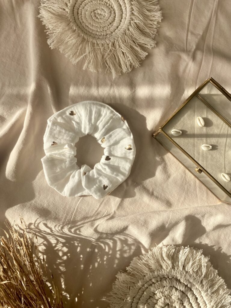 – Scrunchie „Sweetheart“ mit goldenen Herzen aus Musselin Stoff gefertigt –