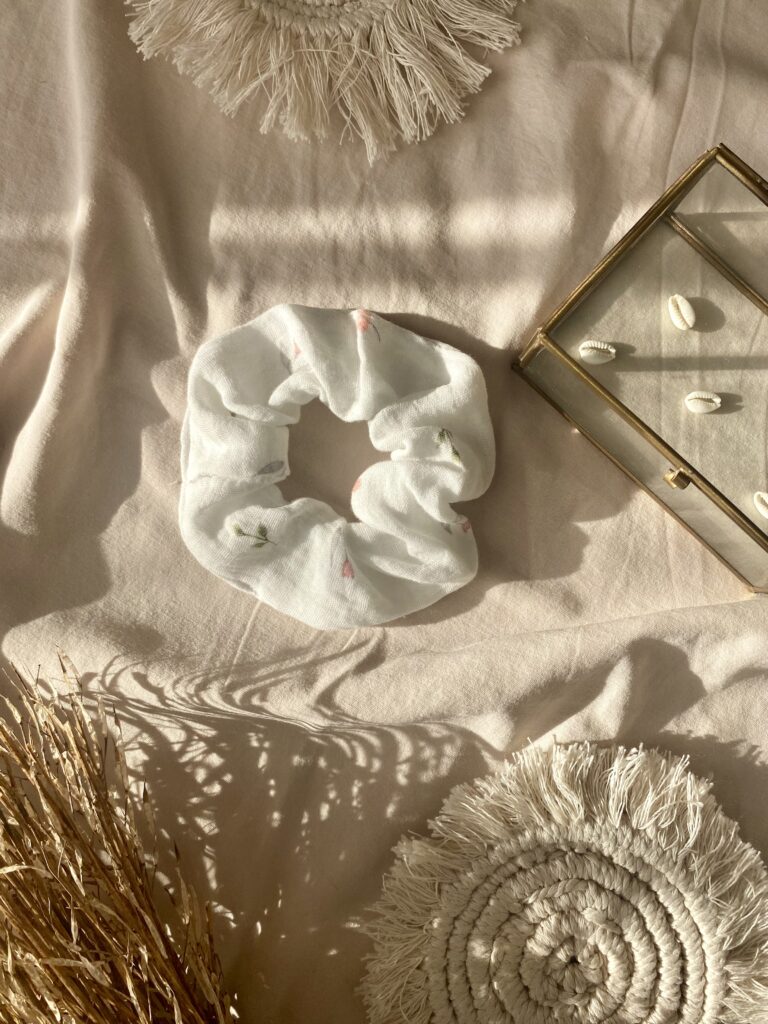 – Scrunchie „Blossom“ mit Blümchen aus Musselin Stoff gefertigt –