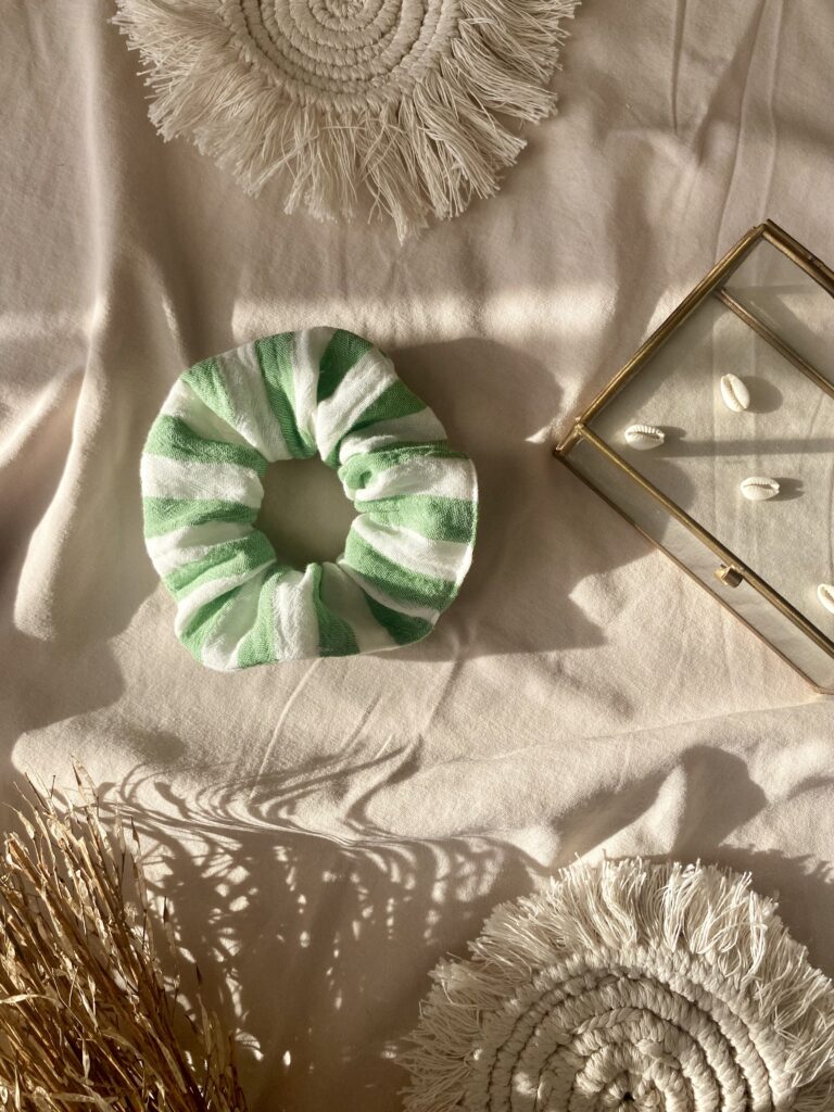 – Scrunchie „Emerald“ in grün/ weiß gestreift aus Musselin Stoff gefertigt –